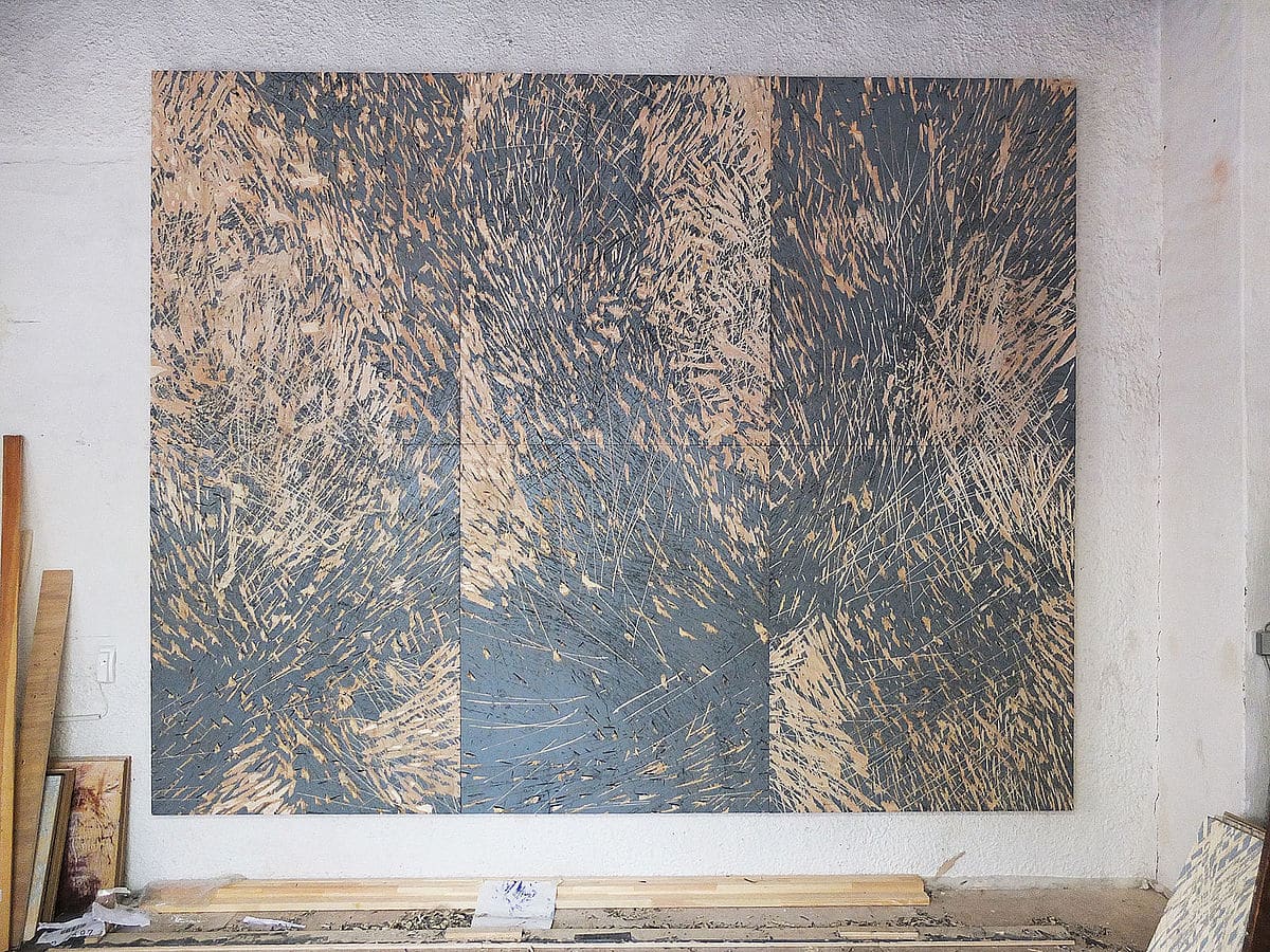 Die Malerei-Absolventin (Abschluss 2017) Hanna Sass zeigt ihr großformatiges Reliefbild Gestik und Struktur II, das von den von ihr genutzten Druckstöcken inspiriert wurde.