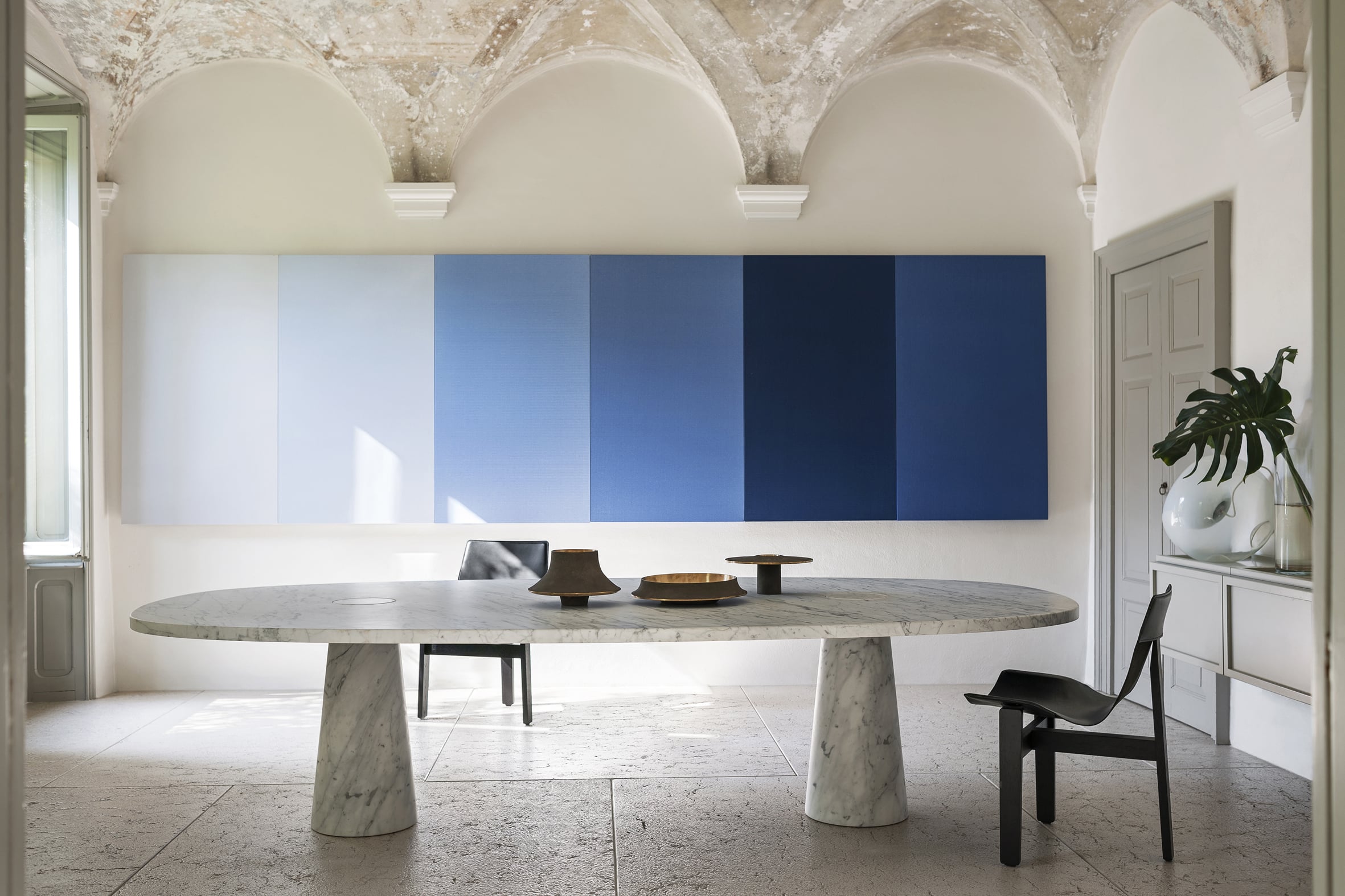 Foscarini interpretiert die Farbe mit den filigranen Leuchten Allumette und Tilia. Die Leuchtenhersteller LEICHT und LUIZ demonstrieren mit HYGGE-Farbwelt und Grace-Serie die Vielseitigkeit des Farbtons. Midgard ergänzt mit ANYO und LOJA moderne Leuchtensysteme. Kvadrat liefert mit Magniberg Gelato textile Lösungen für ein harmonisches Gesamtbild.