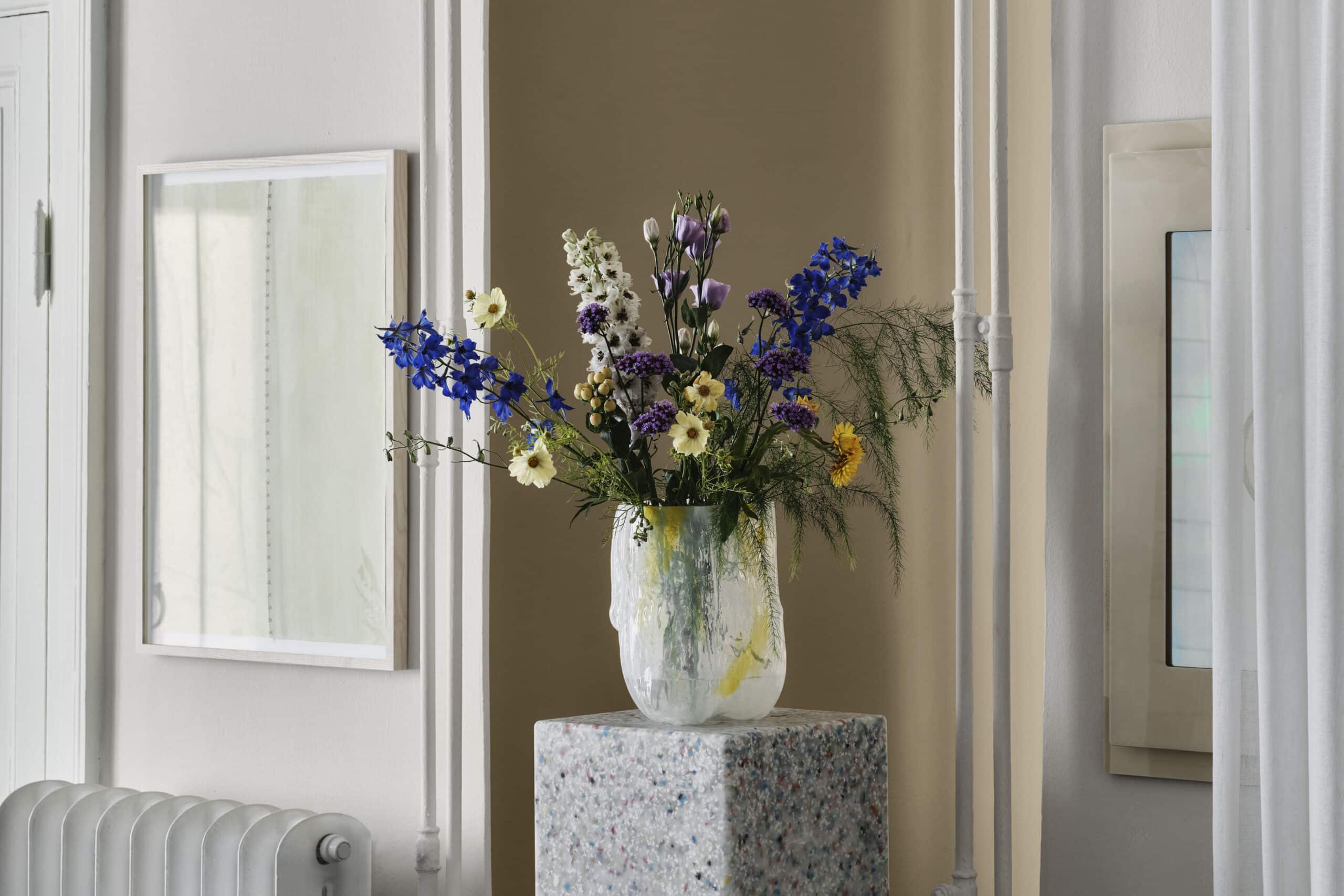 Raumtrenner und modulare Regalsysteme schaffen sanfte Strukturen und geben Ordnung, Tische und Stühle bieten klare Linien, während Leuchten und Textilien für Komfort, Wohlbefinden und harmonische Atmosphäre sorgen. Kosta Boda zeigt mit der Crackle Vase, wie Cloud Dancer auch bei farbigen Akzenten als harmonische Basis funktioniert. Die Materialität, Form und Funktion dieser Produkte unterstreichen die Idee hinter Cloud Dancer und machen die Farbherleitung für das Interior greifbar.