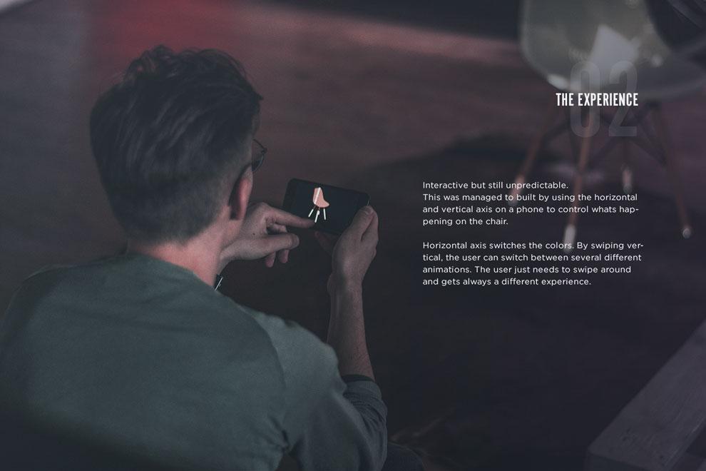 Der „Chair of Chaos“. Per Smartphone kann dabei über eine horizontale und eine vertikale Linie gesteuert werden, was auf dem Stuhl zu sehen ist. Die horizontale Achse verändert die Farben, die vertikale Achse ermöglicht den Wechsel zwischen verschiedenen Animationen. Mit jedem „Swipe“ über den Touchscreen entsteht so ständig ein völlig neues Erlebnis.